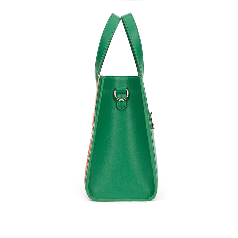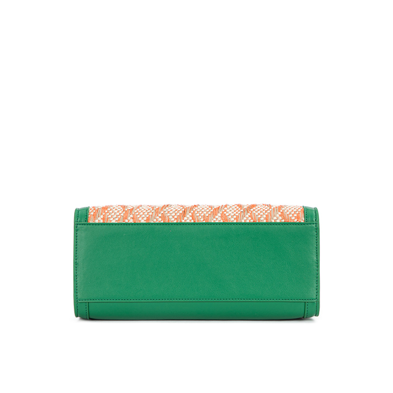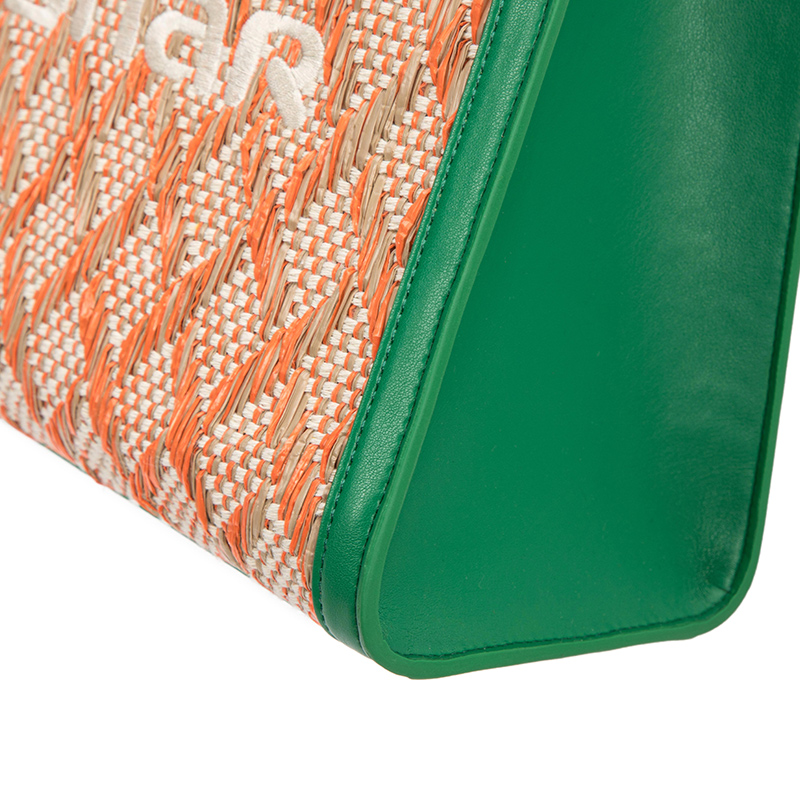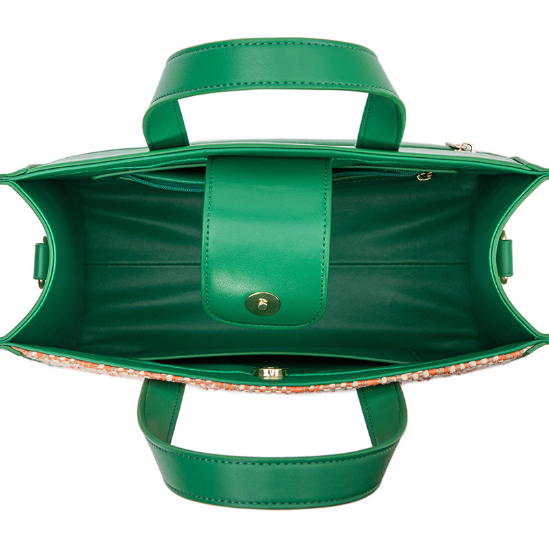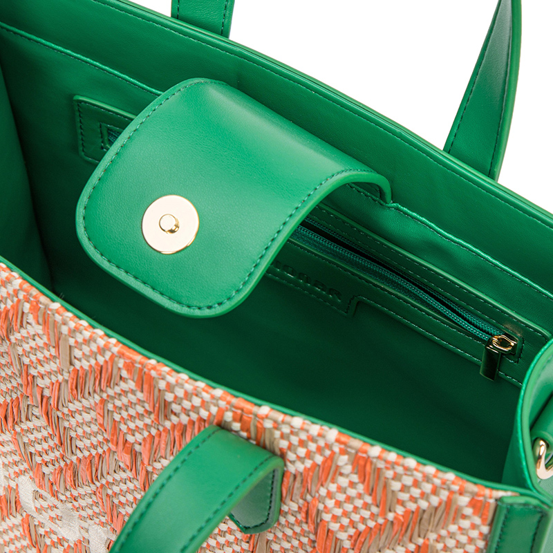 100Soft woven material and genuine leather material; ZORNNA professional hardware design embossing label;Unique weaving process; long shoulder straps can be adjusted at anytime;Exquisite handbag characteristic hardware design;The woven material is distributed in a regular diamond shape, and with a bright green appearance, it presents a different visual impact.