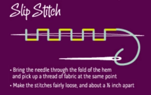 The slip stitch is a nearly invisible stitch that is used to join two pieces of fabric together while minimizing the visibility of the stitches on the right side of the fabric.
