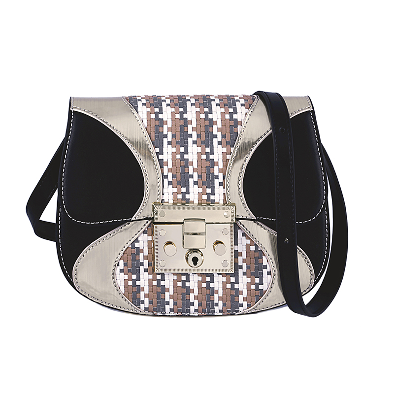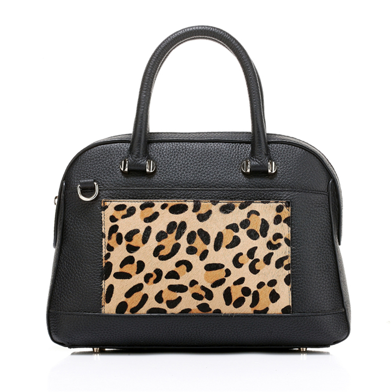 This bag was made of cowhide leather . White color and black color mixed . Very perfect the shape .